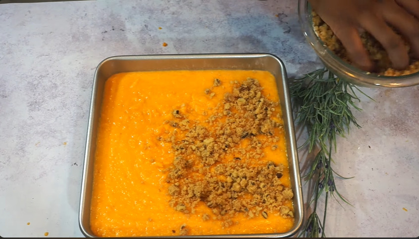 Evenly sprinkle the pecan mixture over the sweet potato filling. Make sure it’s spread to the edges so every bite gets that irresistible crunch.